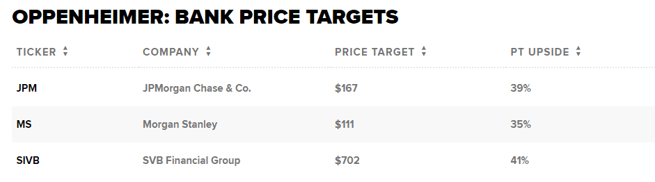 Společnost Oppenheimer zvýšila ratingy společností JPMorgan, Morgan Stanley a SVB Financial Group na „outperform“ z „perform“. Firma rovněž stanovila nové cílové ceny pro tyto akcie s předpokládaným růstem o 35 % až 41 %.