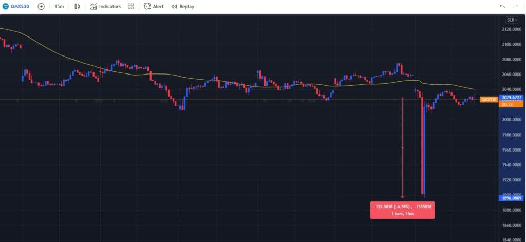 Index OMX Stockholm 30 se během pouhých pěti minut propadl až o 8 % a krátce poté většinu ztrát umazal. V 16:10 se index obchodoval o 1,41 % níže, což zhruba odpovídalo propadu na širších trzích.