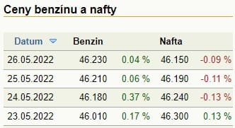 Níže můžete vidět denní změny cen benzínu a nafty.