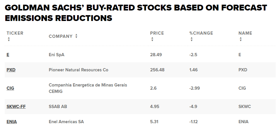 V samostatné obrazovce Goldman také uvedl řadu akcií ropných a plynárenských společností, u nichž očekává nejvyšší očekávané snížení emisí v rozsahu 1 a 2 – emise v rozsahu 1 se vztahují k emisím, které společnost přímo produkuje, zatímco rozsah 2 zahrnuje také některé emise z dodavatelského řetězce společnosti.