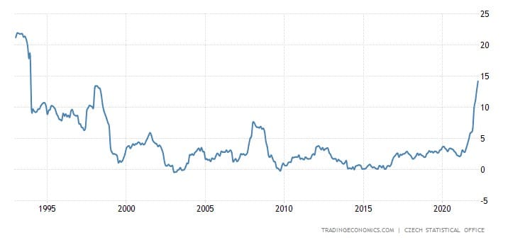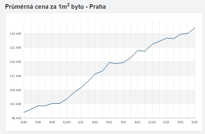 Zdroj: Tradingeconomics.comI takhle by se dala definovat situace s růstem cen v České republice, které patří mezi nejrychlejší v rámci EU. Inflace se začala postupně zvyšovat s ekonomickým oživením po covidu, kdy se do ekonomiky napumpovalo velké množství peněz. A to jak víme z historie vždy nakonec způsobilo inflaci. Další ránu růstu cen zasadil konflikt na Ukrajině a s ním spojený růst cen energií, což, jak se zdá, nemá zatím v dohledné době konce . S tím, jak se bude konflikt protahovat, lze očekávat, že inflace bude dále růst. Většina z nás se tedy logicky ptá, kam s penězi nebo úsporami a jak je maximálně ochránit. Proto jsme pro Vás připravili krátký přehled produktů, se kterými se setkáváme nejběžněji.Česká tisková kancelář uspořádala anketu mezi prodejci drahých kovů, ze které vyplynulo, že prodej zlata v České republice po zahájení ruské invaze na Ukrajinu vzrostl o desítky procent v porovnání s minulým rokem. Dle generálního ředitele společnosti Golden Gate CZ Libora Brůni poptávka po fyzických drahých kovech vzrostla meziročně o 50-100 %.Lenka Klimentová, mluvčí České mincovny, uvedla, že v souvislosti s konfliktem na Ukrajině vzrostly prodeje o třicet procent. Na zlaté slitky zájemci čekají v pořadníku i několik týdnů.Zdroj: Tradingview.comJak ale můžeme vidět z grafu výše, cena zlata se v posledních týdnech pohybuje na maximech z roku 2011. Je tedy otázka, zda je zlato vskutku ochranou proti inflaci a uchovatelem hodnoty. Nákup zlata tedy závisí na důvěře toho konkrétního člověka, případně na jeho preferencích.Broker Consulting Index uvádí, že většina podílových fondů letos prodělává. Akciové fondy do konce dubna ztratily 8,8 %, dluhopisové fondy 6,5 procenta a nemovitostní fondy 1,1 procenta. Výjimkou byly komoditní fondy, které si připsaly 71,5 procenta. Majetek, který mají Češi uložený v podílových fondech, poklesl v prvním čtvrtletí letošního roku o 6,5 miliardy na 701,1 miliardy korun. Loni přitom vzrostl o 118 miliard Kč na 707,6 miliardy korun.Chcete využít této příležitosti?Jednou z nejoblíbenějších forem ukládaní peněz jsou spořicí účty. Dle portálu penize.cz nejvyšší úrok mezi spořícími účty má produkt Hit Plus od Raiffeisenbank, který nabízí zhodnocení 4,5 % ročně. Druhé nejvyšší zhodnocení nabízí Trinity Bank a jejich spořicí účet Výhoda+ s ročním zhodnocením 4,08 %. ČNB však očekává inflaci v tomto roce až 15 %. Když inflace skutečně dosáhne této úrovně, přijdete o 10 % ročně. Spořící účty tak můžeme vnímat jen jako částečné úložiště, když potřebujete mít peníze po ruce v případě neočekávaných výdajů a platíte za to ztrátou hodnoty.Cena za 1m² v Praze – Zdroj: Realitymix.czZ údajů Hypoteční banky vyplývá, že ceny nemovitosti v Česku pokračují v trendu rychlého růstu posledních let. Byty zdražily meziročně o 20,6 procenta, rodinné domy o 19,6 procenta a pozemky o 23,7 procenta. Jedním z nejdůležitějších faktorů pro růst cen nemovitostí je nedostatečná nabídka, růst cen stavebních materiálů a obava z růstu úrokových sazeb.Růst cen nemovitostí proti předchozímu čtvrtletí zrychlil hlavně u bytů na 5,4 procenta z 5 procent v posledním loňském čtvrtletí. U rodinných domů s růstem cen o 4,7 procenta a pozemků mezičtvrtletně dražších o 5,6 procenta je tempo zvyšování cen podobné jako v předchozím čtvrtletí.Mezi hlavní negativum patří vysoké vstupní náklady na koupi nemovitosti. Dle portálu realitymix.cz se pohybuje průměrná cena bytu v Praze za 1 m² na úrovni 128 255 Kč. Pokud byste si chtěli koupit byt o rozloze 70 m², vyšel by vás momentálně na téměř 9 milionů korun. Při mzdě 36 715 Kč čistého měsíčně , byste si museli odložit na koupi bytu téměř 245 měsíčních platů, což znamená, že 20 let byste musel šetřit.Jako poslední si představíme akciový index S&P 500 . Patří mezi nejznámější ukazatele „zdraví“ ekonomiky. Obsahuje 505 největších na burze obchodovaných podniků v USA. Mezi nejznámější patří např. Apple, Microsoft, Visa, Coca Cola, Nike apod. Jednoduše by se dalo říct, že je to v podstatě sdružení těch nejlepších z nejlepších a když se někomu nedaří, jednoduše je v indexu nahrazen někým úspěšnejším. To vám jako investorovi zaručí, že v indexu budou jen ti nejvýkonnější hráči na americkém trhu. Dokonce i samotný Warren Buffett dlouhodobě doporučuje, aby investoři ukládali své peníze do nízkonákladových indexových fondů. Tím máte vlastně i solidní diverzifikaci.