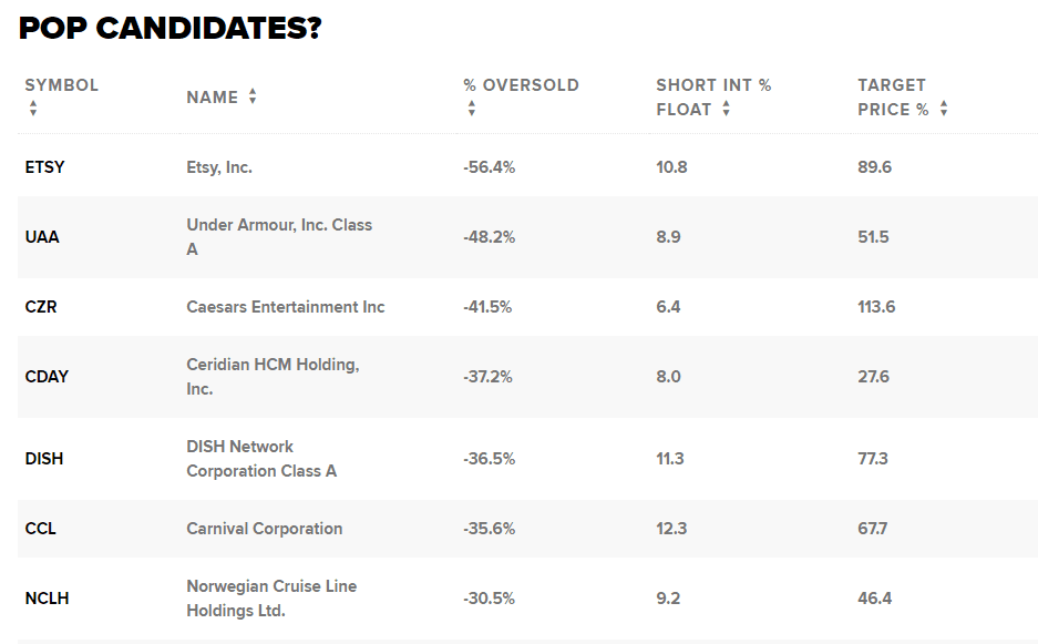 Obchodníci obvykle najdou akcie, které mohou být „přeprodané“, tak, že se podívají na jejich aktuální cenu ve srovnání s průměrnou cenou za posledních 200 dní. Na základě této metriky společnost CNBC PRO prověřila jména, která jsou v indexu S&P 500 nejvíce poražena, a poté přidala několik dalších kritérií, aby našla možné kandidáty na obchodování.Kromě toho, že jsou akcie v našem vyhledávání hluboce přeprodané, mají také vysoký zájem o krátké pozice v poměru k jejich akciím dostupným k obchodování. Pokud mají hedgeové fondy proti akciím značné sázky, mohly by být tyto akcie zralé na short squeeze, pokud by se akcie otočily nahoru a fondy by byly nuceny akcie odkoupit, aby snížily své ztráty.Hledali jsme také akcie, u nichž analytici Wall Street věří, že existuje značný růst na základě perspektivního návratu k jejich konsensuální cílové ceně.Zde jsou akcie, které se objevily na naší obrazovce:Tento seznam nemusí nutně ukazovat dobré dlouhodobé nákupy. Pokud trh obnoví svůj pokles, tyto akcie by mohly být opět tvrdě zasaženy. Seznam je plný „narušených“ jmen z oblasti cestovního ruchu a volného času, která byla letos zasažena souběhem obav včetně možné recese, rostoucích nákladů na pohonné hmoty a války na Ukrajině. Mezi tyto akcie patří Caesars, Carnival a Norwegian Cruise Line.Chcete využít této příležitosti?Na seznamu jsou také hojně zastoupeny akcie související s maloobchodem, přičemž tento sektor tento měsíc utrpěl velké ztráty po varováních společností jako Walmart a Target ohledně rostoucích nákladů a nadměrných zásob, které zasáhly marže. V našem seznamu se mezi těmito akciemi objevily společnosti Best Buy, Bath & Body Works a Under Armour.