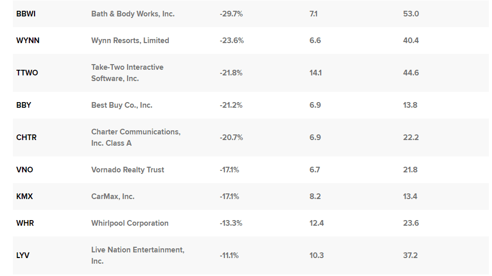 Na seznamu jsou také hojně zastoupeny akcie související s maloobchodem, přičemž tento sektor tento měsíc utrpěl velké ztráty po varováních společností jako Walmart a Target ohledně rostoucích nákladů a nadměrných zásob, které zasáhly marže. V našem seznamu se mezi těmito akciemi objevily společnosti Best Buy, Bath & Body Works a Under Armour.