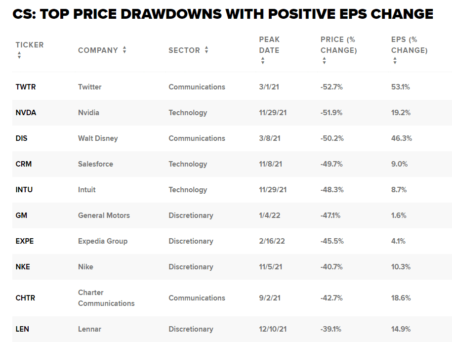 Jedním ze jmen, které se na seznamu objevilo, je Twitter. Tato platforma sociálních médií se v poslední době objevuje na titulních stranách novin poté, co miliardář Elon Musk učinil nabídku na převzetí Twitteru. Twitter se od svého vrcholu propadl o více než 52 %, ale společnost zaznamenala nárůst zisku na akcii o přibližně 53 %.