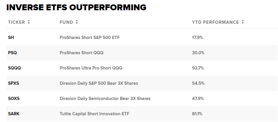 Není překvapením, že mnoho z nejlepších výsledků dosahují ty, které sázejí proti širšímu trhu, což jsou tzv. inverzní ETF.