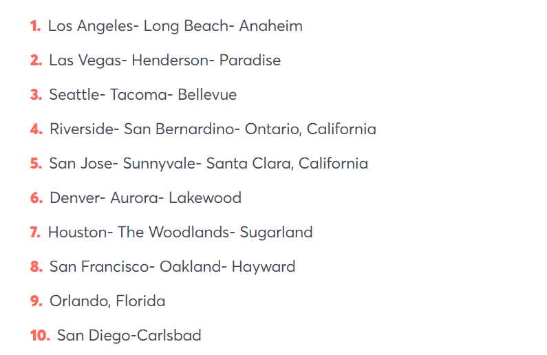 Jedna věc, která vyčnívá: Přibližně polovina nejhůře hodnocených měst se nachází v Kalifornii. A právě tyto oblasti tvoří téměř kompletně pět nejhorších míst v žebříčku dostupnosti bydlení. Z hlediska dostupnosti bydlení je Riverside na 42. místě, San Diego na 47. místě, San Francisco na 48. místě, Los Angeles na 49. místě a San Jose na 50. místě.