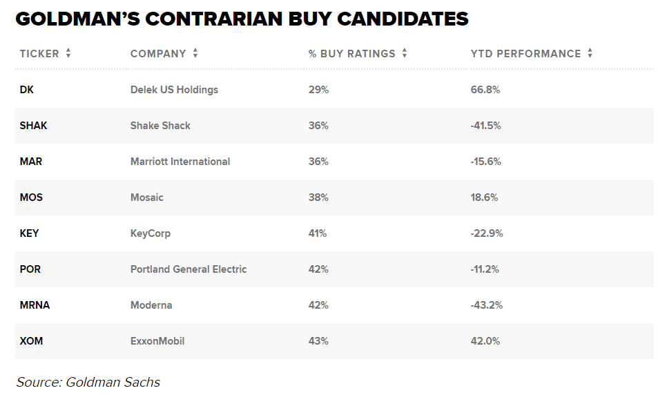 „Tato jména se zdají být trhem podceňována a mohla by generovat alfu pro investory s opačným pohledem. U každé z níže uvedených jsou odhady GS v roce 2022 alespoň 2 % nad konsensem,“ uvedl Mehta v poznámce klientům minulý týden.