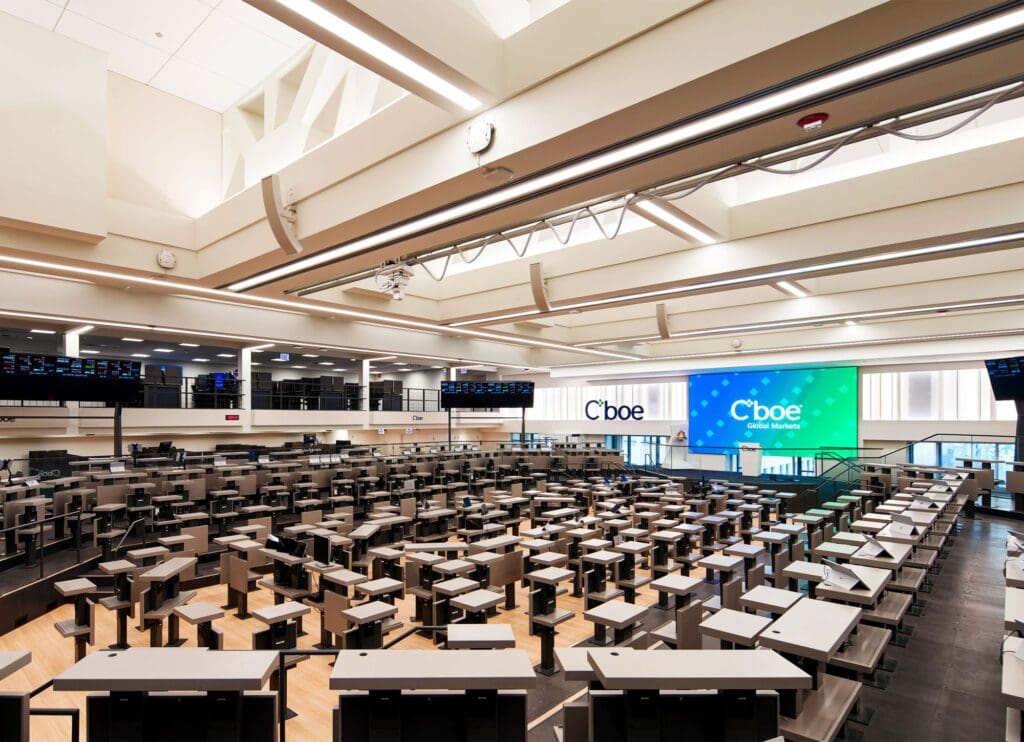 V nových prostorách společnosti Cboe se nachází přibližně 120 obchodních kabinek a více než 330 kiosků, do kterých mohou makléři a tvůrci trhu zapojit své individuální systémy. Stejně jako NYSE je i na podlaze CBOE umístěn zvonek na plošině s výhledem na obchodní plochu, na který mohou hosté každý den zazvonit při zahájení a ukončení obchodování.