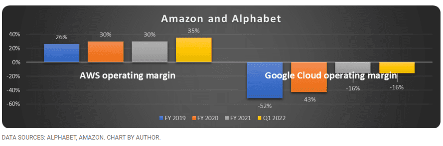 Společnost AWS je vysoce zisková. V omáčce výsledků za 1. čtvrtletí se ztratil nárůst provozní marže segmentu na masivních 35 %. Naproti tomu segment Google Cloud je pro Alphabet ztrátový. Následující graf porovnává provozní marže obou cloudových podniků.