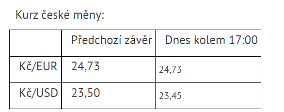 Koruna k euru stagnuje již delší dobu a nic na tom nezměnilo ani zvýšení úrokových sazeb tuto středu. Podle analytiků je to tím, že navýšení trhy očekávaly a měly ho již zahrnuté v ceně. K dolaru koruna zpevnila o pět haléřů na 23,45 Kč/USD.
