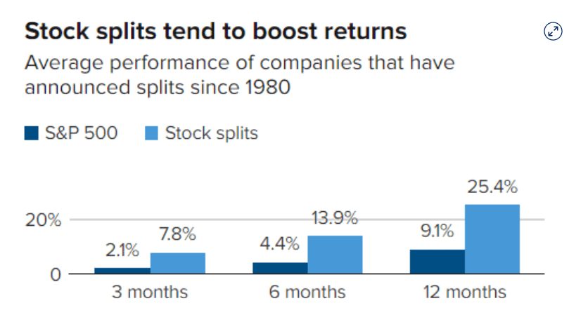 Pokud historie něco naznačuje, rozdělení akcií má tendenci akcie povzbudit. Podle Bank of America od roku 1980 společnosti z indexu S&P 500, které oznámily rozdělení akcií, výrazně překonaly výkonnost indexu tři, šest a 12 měsíců po prvním oznámení.