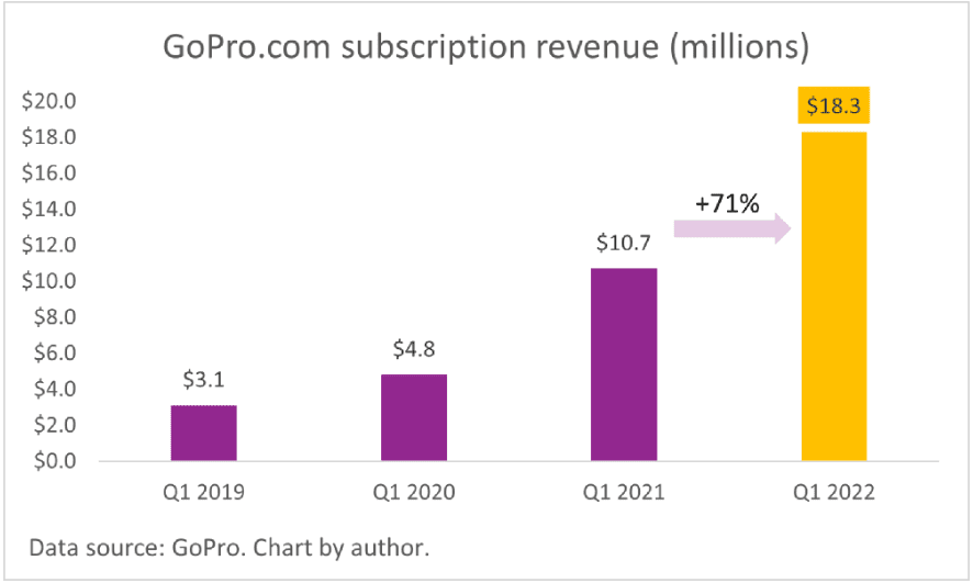 Největším zdrojem stálých příjmů společnosti GoPro je však prozatím předplatné GoPro.com, které zákazníkům nabízí exkluzivní slevy na produkty, cloudové úložiště pro videa a možnost živého vysílání ze zařízení GoPro. V prvním čtvrtletí pokračoval hvězdný růst a počet předplatitelů se meziročně zvýšil o 85 % na 1,74 milionu, čímž příjmy z předplatného prudce vzrostly.