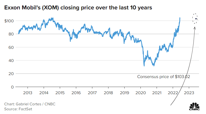 Exxon uzavřel ve čtvrtek na novém historickém maximu 104,59 USD, čímž tento týden poprvé od roku 2014 překonal hranici 100 USD. Akcie patří mezi 10 nejvýkonnějších v rámci indexu S&P 500 v letošním roce, když v roce 2022 vzrostly o 67 %.