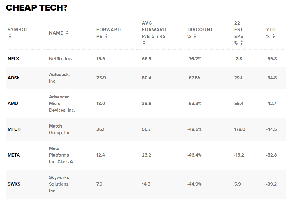 V čele seznamu je Netflix, jehož forwardové P/E je o 76 % nižší než pětiletý průměr. Vzhledem k tomu, že akcie letos klesly o téměř 70 %, přitahují pozornost hodnotových investorů, jako je Bill Nygren z Oakmark Funds.