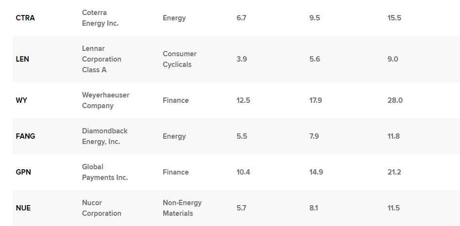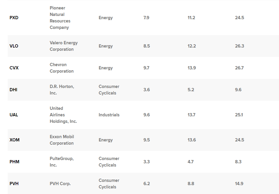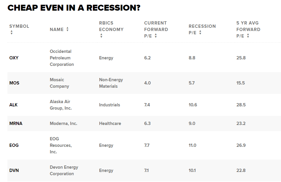 Na seznam se dostalo mnoho energetických akcií. Očekává se, že akcie Occidental Petroleum se budou prodávat za 8,8násobek zisku po očištění o recesi, což znamená, že se budou obchodovat s 65,7% diskontem oproti svému pětiletému průměrnému forwardovému P/E ve výši 25,8. Akcie společnosti Valero Energy by se měly obchodovat s P/E 12,2 i v případě recese, což znamená 54% diskont vůči jejímu pětiletému průměrnému forwardovému zisku. Očekává se, že akcie společnosti Diamondback Energy se budou v době recese obchodovat za 7,9násobek zisku, tedy s 33% diskontem.