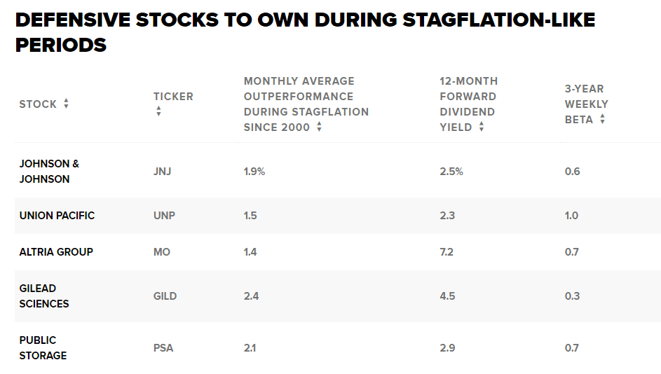 Jefferies vyzdvihl několik defenzivních akcií, které dosáhly lepších výsledků v jiných obdobích zpomalování růstu a zvýšené inflace. Všechny mají tržní kapitalizaci alespoň 2 miliardy dolarů. Mají také pozitivní průměrnou měsíční výkonnost v předchozích „obdobích podobných stagflaci“ od roku 2000, vysoký výnos a podprůměrnou volatilitu (beta).