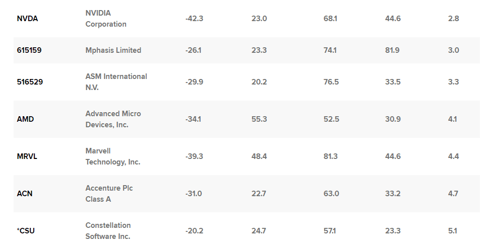 Není překvapením, že se na obrazovce objevila řada akcií polovodičů. Po letech, kdy akcie polovodičů dosahovaly nejvyšších výnosů na trhu, se letos propadly. Fond iShares Semiconductor ETF (SOXX), který sleduje výkonnost polovodičů, se od začátku roku propadl o více než 20 %.