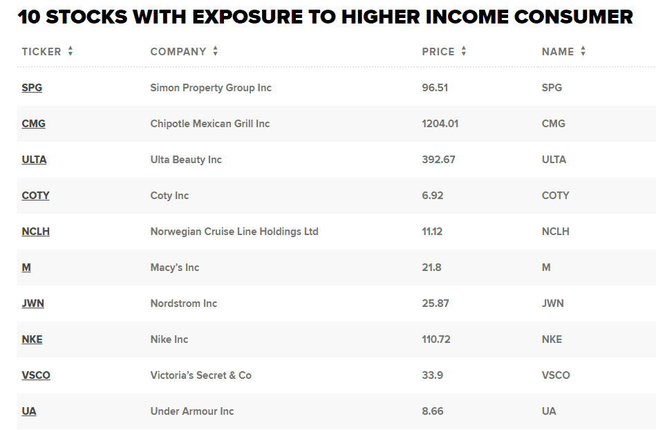 Akcioví stratégové UBS zjistili, že akcie vystavené spotřebitelům s vyššími příjmy převyšují od konce dubna akcie zaměřené na spotřebitele s nižšími příjmy o 5 %, uvádí se v úterním sdělení. Zákazníci s vyššími úsporami a větším disponibilním příjmem jsou schopni utrácet za luxusní zboží navzdory růstu cen potravin a benzínu.„Zatímco počáteční nárůst spotřebitelských výdajů byl poháněn tématem znovuotevření, očekáváme, že se objeví další téma poháněné výdaji domácností s vyššími příjmy ve srovnání s domácnostmi s nižšími příjmy“, uvádí zpráva.„To by mělo podpořit i prémiové/luxusní značky oproti hodnotným, protože větší spotřeba se přesouvá na vyšší stupnici kvality,“ pokračuje zpráva.Hledání akcií, které by mohly profitovat z dalšího růstu cen, přineslo desítky jmen. UBS provedla screening akcií s luxusní tematikou. Stratégové firmy pak prověřovali akcie podle citlivosti beta ve 40. percentilu shora a zdola, statistické významnosti beta a prověřovali tržní kapitalizaci vyšší než 1 miliarda USD.Zde je 10 jmen, která se objevila při screeningu společnosti UBS:Kosmetická společnost Coty bude těžit z vyšších příjmů spotřebitelů. Akcie společnosti vzrostly o více než 5 % poté, co společnost Coty potvrdila svůj výhled na aktuální čtvrtletí a celý rok.Chcete využít této příležitosti?Macy’s získává podporu od zákazníků, kteří si pořizují nové oblečení a luxusní zboží. Maloobchodní řetězec v posledním čtvrtletí překonal očekávání ohledně zisku a tržeb.Společnost Nike má cenovou sílu, která jí umožňuje přenést vyšší náklady na spotřebitele. Značka sportovního oblečení čelí problémům kvůli výlukám Covid v Číně, ale analytici Stifel přesto počátkem tohoto měsíce potvrdili nákupní doporučení pro akcie.Zdroj: ShutterstockMezi dalšími jmény, která se objevila, jsou Under Armour, Victoria’s Secret, Nordstrom, Norwegian Cruise Line Holdings, Ulta, Chipotle a Simon Property Group.Stratégové UBS také našli jména, která jsou více vystavena spotřebitelům s nižšími příjmy:Mezi akcie s nižšími příjmy spotřebitelů patří Abercrombie and Fitch. Minulý měsíc tento maloobchodní prodejce oděvů oznámil, že v posledním čtvrtletí vzrostly zásoby o 45 % oproti stejnému období před rokem. Abercrombie and Fitch snížila svůj odhad tržeb pro letošní rok.Restaurace rychlého občerstvení Yum! Brands má expozici vůči spotřebitelům s nižšími příjmy. Minulý měsíc banka UBS potvrdila pro majitel Pizza Hut a Taco Bell rating „buy“ díky svému rozsahu a konkurenčnímu postavení.Zdroj: ShutterstockMezi další akcie s expozicí vůči spotřebitelům s nižšími příjmy patřily Gap, Ollie’s, Six Flags, Kohl’s, Carnival Corporation, Dollar General, Five Below a Wendy’s.