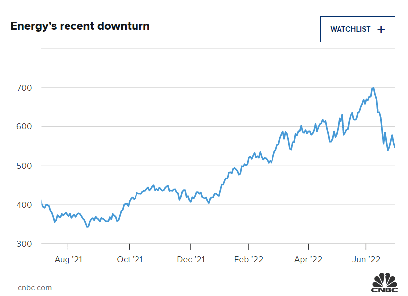 Akcie energetických společností se v posledních týdnech potýkají s výrazným oslabením a tato skupina se nyní nachází v teritoriu medvědího trhu, když od nedávného maxima z 8. června poklesla o 22 %. Pokles přichází v kontextu širokého výprodeje na trhu, který ovlivňují obavy z recese. Energetika je stále jediným pozitivním sektorem v tomto roce – vzrostla o 29 % – což znamená, že investoři mohou prodávat i vítězné obchody, aby pokryli ztráty, kterým čelí jinde.