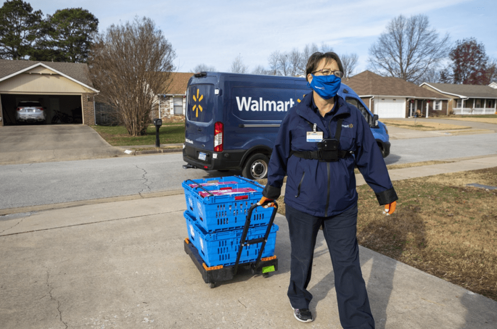 Walmart se opírá o tisíce svých obchodů, aby mohl rychle a s nižšími náklady doručovat nákupy online – a konkurovat tak společnosti Amazon, online konkurentovi známému svou rychlostí. Zavedl a rozšířil služby elektronického obchodování, včetně služby InHome, která zákazníkům doručuje potraviny přímo do ledničky, a služby Express Delivery, která zákazníkům doručí nákupy ke dveřím do dvou hodin. Neomezené doručování potravin do domu je také klíčovou výhodou služby Walmart+, ročního členství, kterou chce tento velkoplošný prodejce rozšířit.