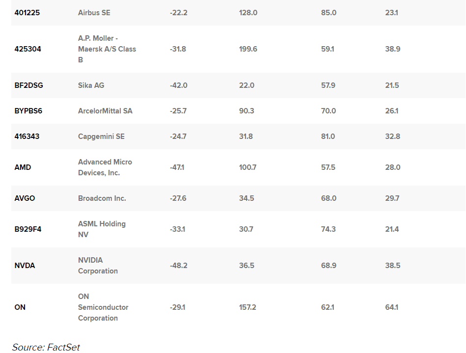 Mezi další akcie, které se dostaly na obrazovku, patří průmyslové akcie Airbusu a dánské lodní společnosti A.P. Moller, německá společnost Siemens Healthineers vyrábějící zdravotnické přístroje, švýcarská společnost Sika vyrábějící speciální chemikálie, výrobce oceli ArcelorMittal a francouzská poradenská společnost Capgemini.