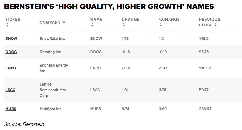 Sacconaghiho tým také představil obrazovku ukazující akcie, které se jim na současných úrovních nejvíce líbí. Tato jména podle Bernsteina nabízejí rychlejší růst a „vysokou kvalitu“.