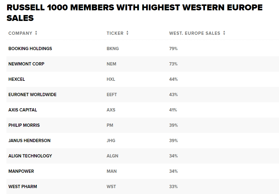 Goldman Sachs sestavil koš 50 akcií z indexu Russell 1000, které mají největší podíl tržeb v Evropě, především v západní a severní Evropě. V době, kdy analytici v čele s Davidem Kostinem koncem června zveřejnili zprávu, tento koš v letošním roce zatím zaostával za indexem S&P 500 o 2,4 procentního bodu a prodával se za podprůměrný forwardový násobek P/E.
