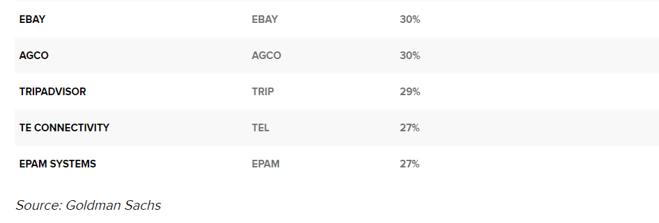 Desítku nejlepších akcií uzavírají Janus Henderson Group a Philip Morris International, obě s 39 %, Align Technology a Manpower Group, obě s 34 %, a West Pharmaceutical s 33 % tržeb v západní Evropě, uvádí Goldman.
