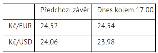 Vůči dolaru naopak česká měna ve srovnání se čtvrtečním závěrem posílila o osm haléřů a dostala se zpět pod 24 korun za dolar. V 17:00 se podle serveru Patria Online obchodovala za 23,98 Kč/USD.