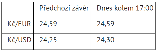 V 17:00 se podle serveru Patria Online obchodovala za 24,59 Kč/EUR, tedy ve stejném kurzu jako při úterním závěru. Vůči dolaru česká měna oslabila o pět haléřů na 24,30 Kč/USD.