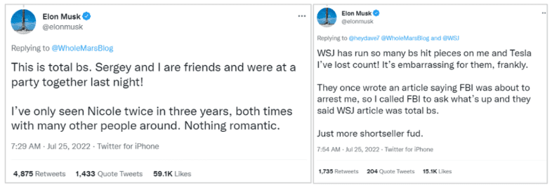 Musk jasně uvádí, že se se Shanahanovou viděl za poslední tři roky pouze dvakrát, a to ještě na veřejnosti, a že mezi nimi nevznikl žádný románek. Dokonce uvedl, že byl s Brinem ještě včera večer na večírku a jsou stále přátelé.