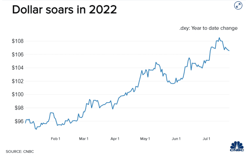 Obavy z globálního růstu způsobily, že bezpečný dolar letos stoupl. Dolarový index, který sleduje zelenou bankovku vůči šesti hlavním měnám, dosáhl na začátku tohoto měsíce několikaletého maxima. Zelená bankovka také dosáhla několikaletých maxim vůči měnám, jako je euro a jen.