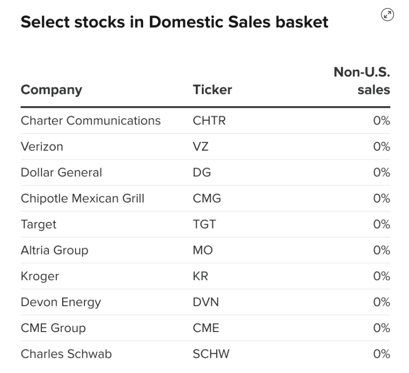 Stratégové uvedli, že společnosti, které se zaměřují na domácí prodej, již dosahují lepších výsledků než ty, které se spoléhají na mezinárodní prodej. Odvětvově neutrální koš společností z indexu S&P 500 s nejvyšší expozicí vůči domácím prodejům podle Goldmanu od počátku roku překonal srovnatelný koš akcií zaměřených na zahraniční prodeje o 11 procentních bodů.