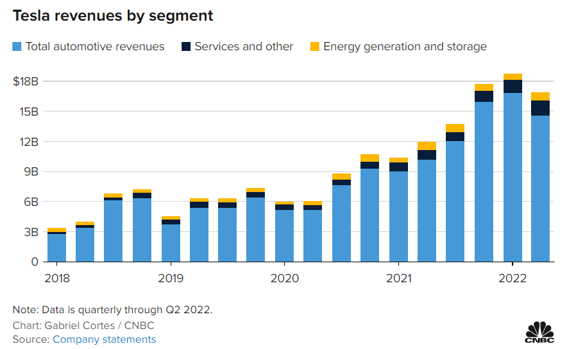 Hrubá marže v automobilovém průmyslu dosáhla 27,9 %, což je méně než 32,9 % v minulém čtvrtletí a 28,4 % před rokem, což je ovlivněno inflací a větší konkurencí v oblasti bateriových článků a dalších komponentů, které se používají v elektromobilech. Tržby z automobilového průmyslu tvořily 14,6 miliardy dolarů z celkových tržeb společnosti, 1,47 miliardy dolarů pocházelo ze služeb a ostatních tržeb a 866 milionů dolarů z energetického segmentu společnosti.