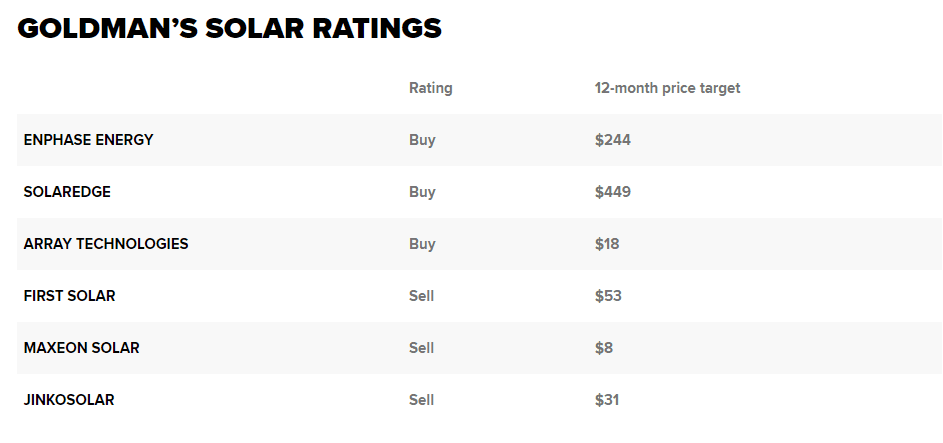 Na druhou stranu je Goldman Sachs opatrný, pokud jde o dodavatele panelů, a hodnotí společnosti First Solar, JinkoSolar a Maxeon Solar jako „prodej“.