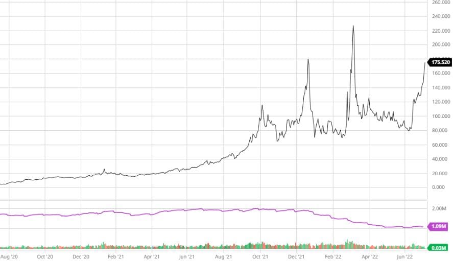 Cena evropského plynu za poslední dva roky – Zdroj: Barchart.com