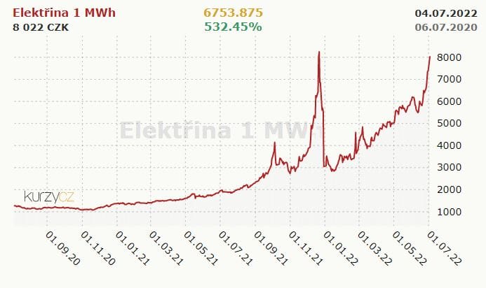 Cena elektřiny na burze za poslední dva roky (nárust přes 500%!) – Zdroj: Kurzy.cz
