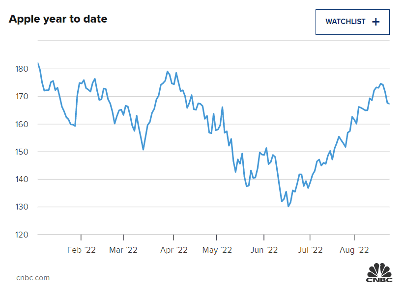 Společnost Apple v roce 2022 překonala index S&P 500 a v srpnu vzrostla o 3,3 %, zatímco index dosáhl sotva kladného výsledku. Od 30. června si Apple připsal 22,6 % ve srovnání s 9,3% ziskem indexu S&P 500.
