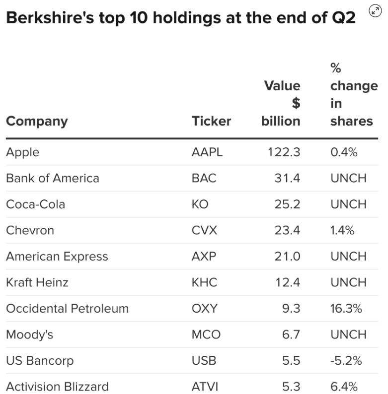 Zde je 10 největších podílů v masivním akciovém portfoliu společnosti Berkshire na konci druhého čtvrtletí.