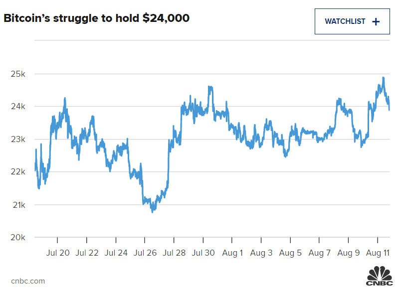 Bitcoin se potýká s úrovní 24 000 USD poté, co v červnu našel své pomyslné minimum pro tento cyklus a v červenci pokračoval v růstu o více než 20 %, což byl jeho nejlepší měsíc v tomto roce.