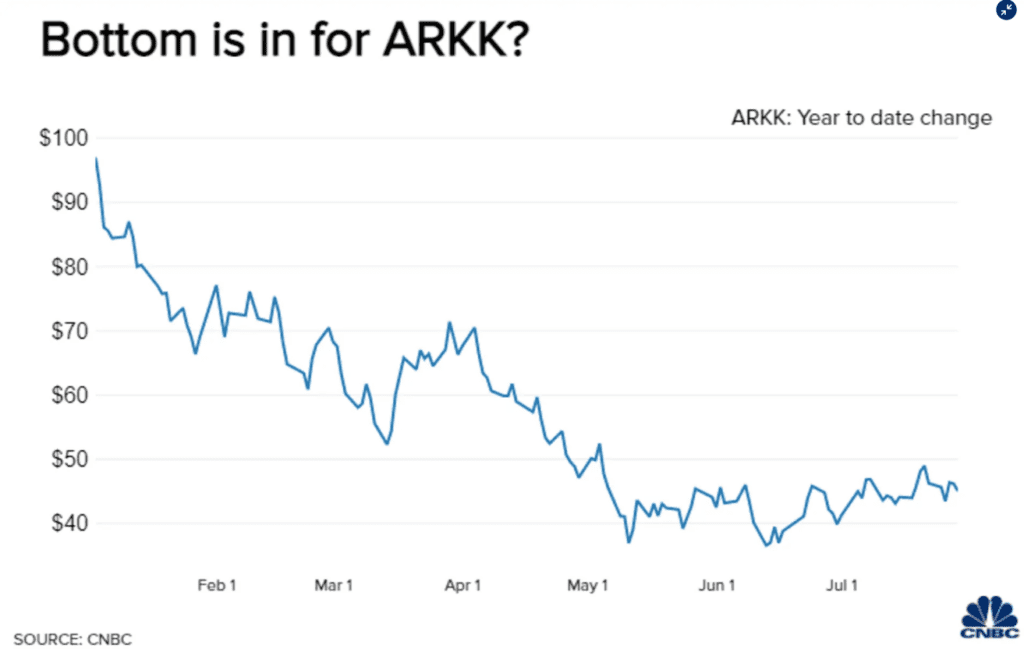 „Vypadá to, že alespoň zatím jsme na základě naší vlajkové strategie dosáhli dna na intradenní bázi 12. května. Ve skutečnosti jsme dosáhli dna dříve než Nasdaq a S&P,“ řekla Woodová. „To byl brzký signál, že bychom se zde mohli obrátit.“