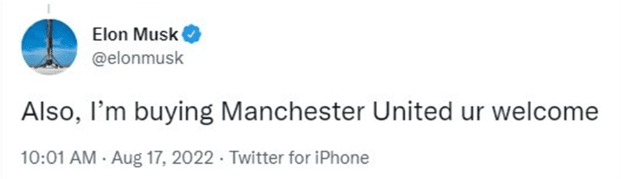Asi čtyři hodiny předtím Musk napsal na Twitter: „Kupuji Manchester United, nemáte zač,“ aniž by nabídl jakékoli podrobnosti. Někteří fanoušci Manchesteru United, nespokojení s upadajícím stavem svého klubu v poslední době, již dříve na Twitteru vyzvali Muska, aby zvážil koupi klubu.