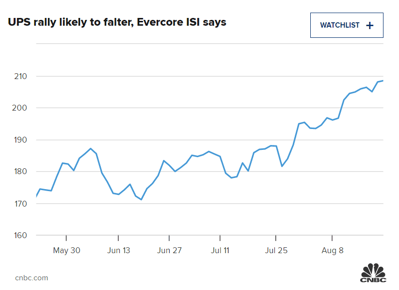 „Je pravda, že UPS byla v předchozích obdobích rozkolísaných trhů do jisté míry relativně defenzivní bezpečnou akcií, ale vzhledem k riziku souvisejícímu s makrem, které se týká již tak podprůměrného růstu zisku na akcii, který předpovídáme na příští rok, se zdá být pravděpodobnější relativní násobný pokles po období výrazného překonávání výkonnosti, pokud se znovu objeví širší obavy na akciových trzích,“ řekl.
