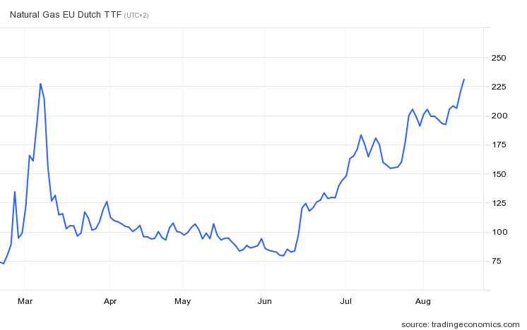 Po pondělním růstu o 6,8 % vzrostly futures kontrakty na zemní plyn až o 6,5 %. Horké a suché počasí způsobuje rychlý pokles hladiny vody v řekách, což ztěžuje přepravu energetických komodit. Je pravděpodobné, že to donutí energetické společnosti používat více plynu jako náhradu v době, kdy jsou dodávky z Ruska nadále omezovány.