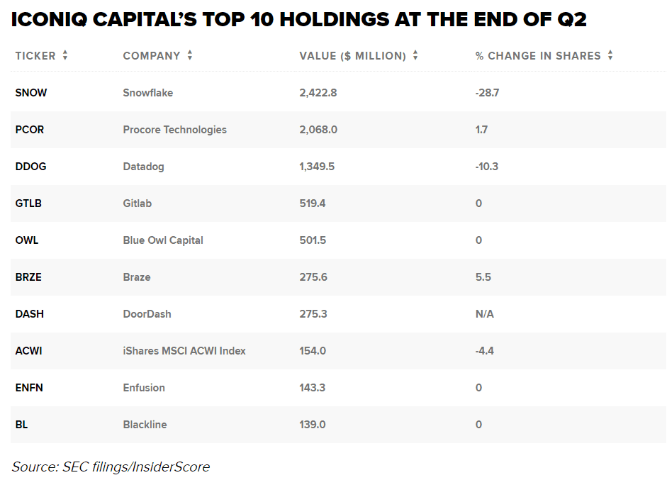 Společnost Snowflake byla na konci druhého čtvrtletí největším podílem společnosti Iconiq s hodnotou zhruba 2,42 miliardy dolarů. Podle InsiderScore společnost v tomto období snížila svůj podíl o téměř 29 %. Akcie této cloudové společnosti se letos propadly o 55 % a jsou zhruba 62 % pod svým maximem.