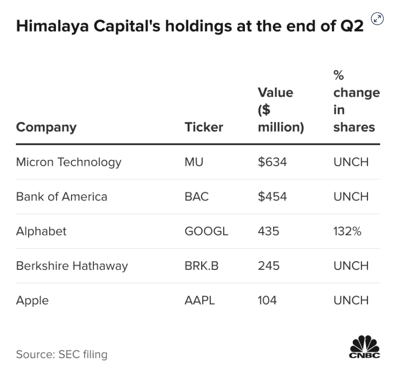 Během druhého čtvrtletí Himalaya více než zdvojnásobila svůj podíl ve společnosti Alphabet, čímž se mateřská společnost Googlu stala jejím třetím největším podílem po Micron Technology a Bank of America. Mezitím se v posledním čtvrtletí zcela zbavila svého podílu ve společnosti Meta Platforms.