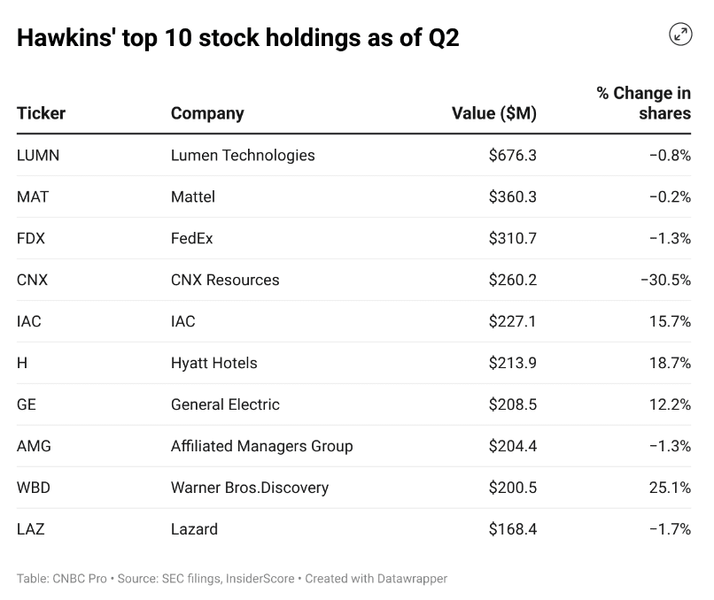 Hawkinsova společnost Southeastern Asset Management, která provozuje sadu podílových fondů s názvem Longleaf Partners Funds, v minulém čtvrtletí podle InsiderScore navýšila své akcie General Electric o 12 %. V tříměsíčním období končícím 30. června držel fond 3,28 milionu akcií v hodnotě 208,5 milionu USD.