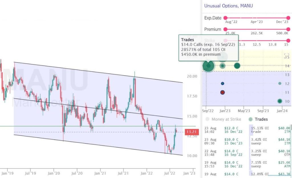 Jak ukazuje výše uvedený graf, MANU má nyní nadměrnou aktivitu kupních opcí soustředěných u realizační ceny 14 USD. To je méně než jeden dolar od současné ceny a datum expirace pro out-of-the-money calls je 16. září. Před vypršením platnosti na konci roku se uhnízdily další kupní smlouvy, které byly umístěny tento týden a představují 18 % otevřeného zájmu.