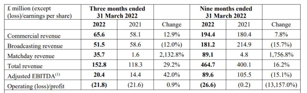 Po započtení celkových provozních nákladů ve výši 175,3 milionu liber za čtvrtletí a cen zaměstnaneckých benefitů ve výši 101,8 milionu liber klub za čtvrtletí prodělal 21,8 milionu liber (25,57 milionu USD). Všechna tato čísla však byla ovlivněna výpadky kvůli Covidu v předchozím roce, proto je uvedeno, že příjmy z utkání meziročně vzrostly o více než 2 000 %.