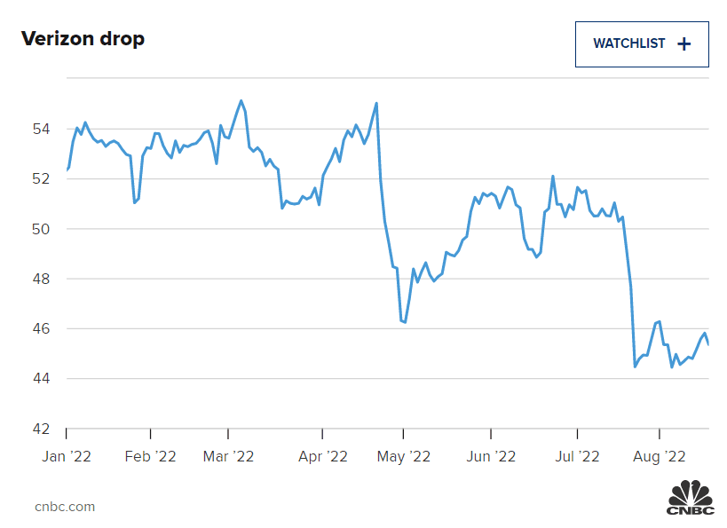 Akcie Verizonu od začátku roku klesly o 12 % a zaostaly tak za poklesem indexu Dow Jones Industrial Average o 6,5 %.